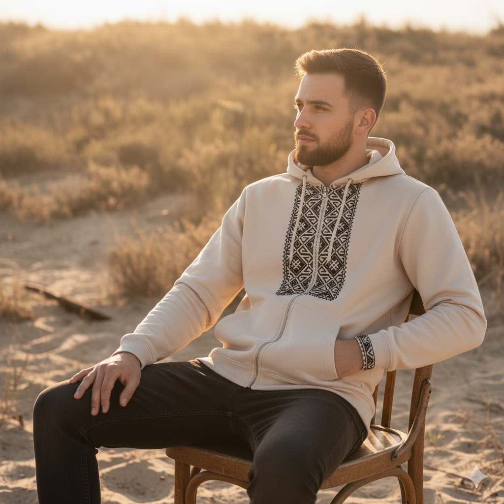 Hoodie Beige à Broderie Traditionnelle – Style & Confort Premium